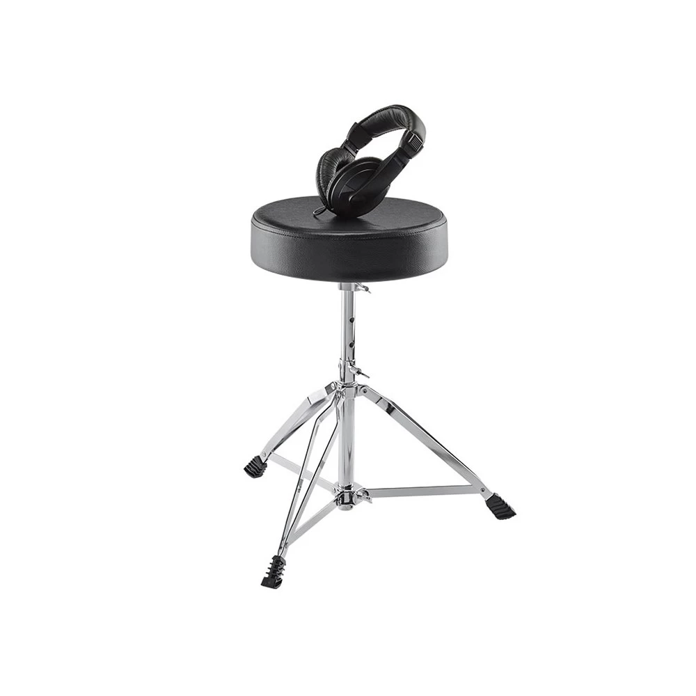Easily add premium hardware and accessories to your electronic kit with the Alesis Drum Essentials bundle. This bundle includes an adjustable double-braced drum throne that provides comfort and support for drummers of all ages. This throne is easily collapsible, perfect for storage or travel. Also included are premium headphones, featuring an on-ear design to drown out distractions so you can focus on what matters
