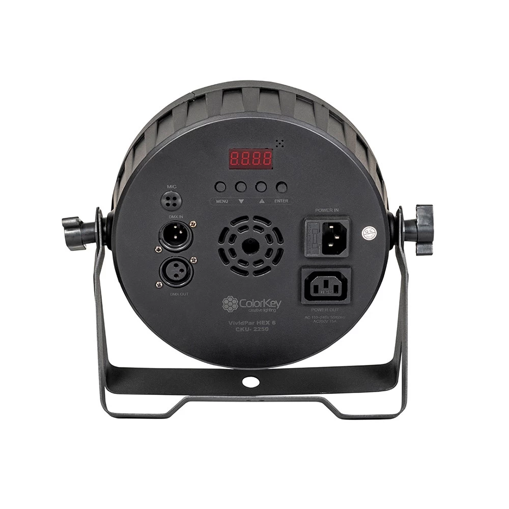 Take advantage of the built-in Master/Slave Auto-programs and let VividPar HEX 6 run unique lighting show when more than one VividPar HEX 6 is connected in series. Get the effects of a programed lighting controller all with our built-in Auto-program settings. Power and DMX 56 in/out make VividPar HEX 6 a great choice for Mobile DJs, Bars, Clubs and Corporate Events.