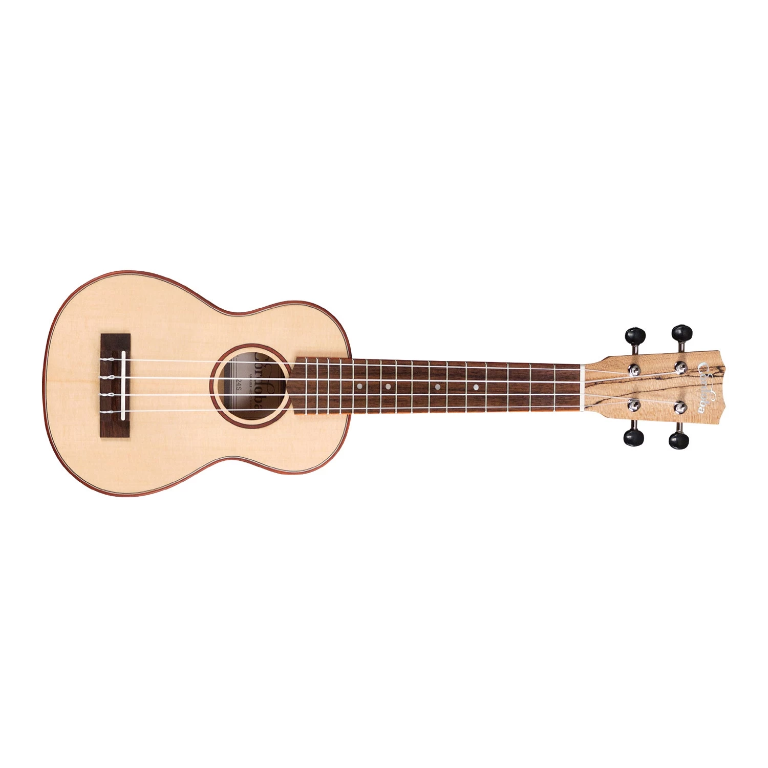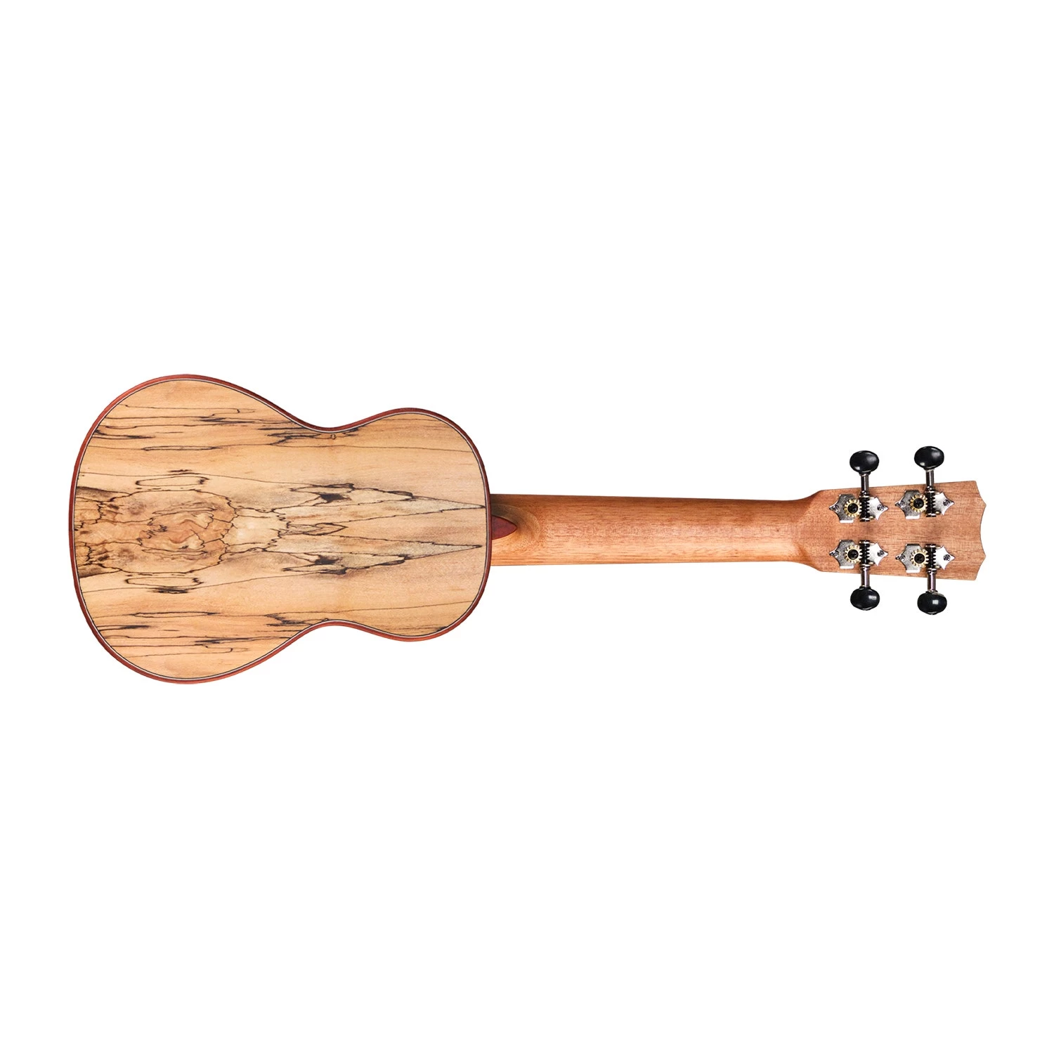 The new, 24 series ukuleles offer a combination of exotic tone woods. Spalted maple back and sides offer a unique look and tone, while a solid spruce top projects a voice much larger than its size suggests. Deep red, padauk body and fingerboard binding, combined with a padauk rosette, add a beautiful pop of burgundy to their already striking appearance. Additional features include a mahogany neck and spalted maple headstock veneer and a satin polyurethane finish.