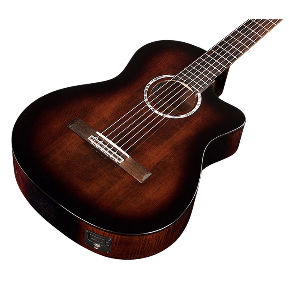 Córdoba’s entry into the fusion line! The perfect choice to transition from a steel string to a nylon guitar, the Córdoba Fusion 5 features a solid spruce top, mahogany back and sides, a full body with cutaway for extended playing range, side dot fret position markers, and a pearl decal rosette and arches. The fusion neck with a 16” radius fretboard and smaller, 1 7/8” (48mm) nut width provides a playing experience very close to that of a steel string guitar. This familiarity offers an easy transition for steel string players and players with smaller hands to the world of nylon string guitar. Added side dot markers also depart from traditional nylon string guitar construction, providing players reference for their position on the fretboard. Equipped with the Fishman Sonitone Pickup System, the Fusion 5 is ready to plug in and play. Available in Gloss Natural finish with mahogany back and sides and Gloss Sonata Burst with elegant flamed mahogany back and sides.