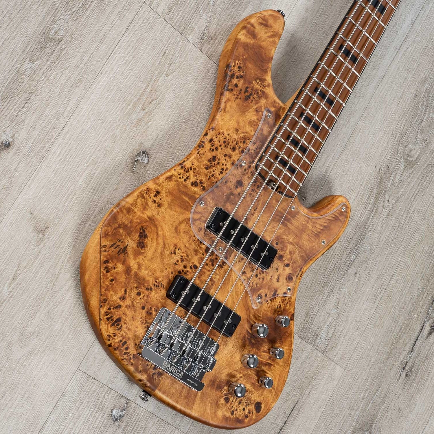 Oftentimes the weight of the instrument affects the playing experience, and on a larger instrument like a bass guitar more fatigue is caused by heavier weight. While many manufacturers seek solutions by carving out large sections of body wood to reduce weight, the GB Modern’s body is cleverly designed to be just as light without physically tempering the body. The maple body core is paired with light-weight paulownia wings, then gets covered with gorgeous poplar burl on the top side and white ash on the back, resulting in a combination of great tonewoods that is excellent both sonically and aesthetically.