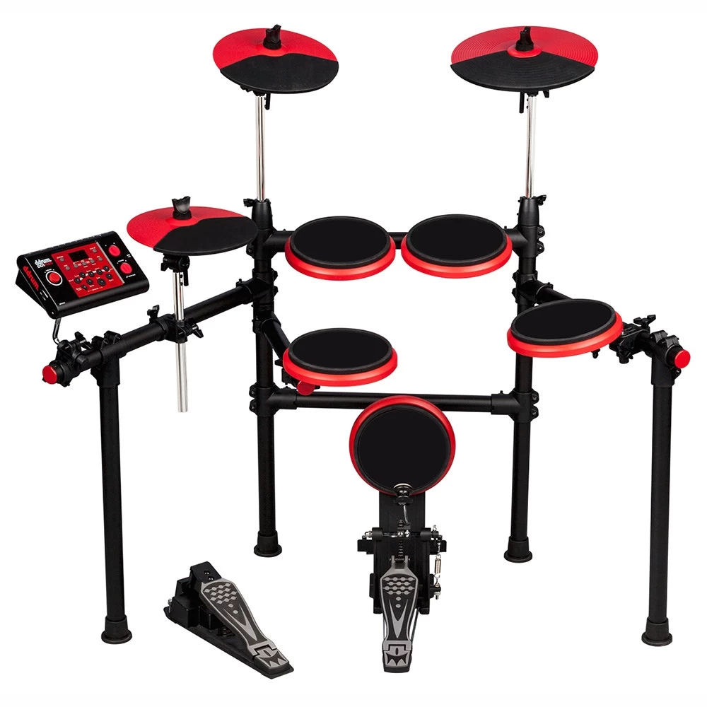 DD1 plus rack is rock solid with high grade components.Has (9) inputs, 1/4″, midi out, aux in/out, (35) on board kits, gain and reverb control, high hat controller, and bass drum pedal included. Includes the cable harness as well. Retail ready, and the red/black look of the kit helps you sell it. It visually POPS on the floor. Perfect for the smaller church market, or anyone who needs a good quality entry elec. kit.