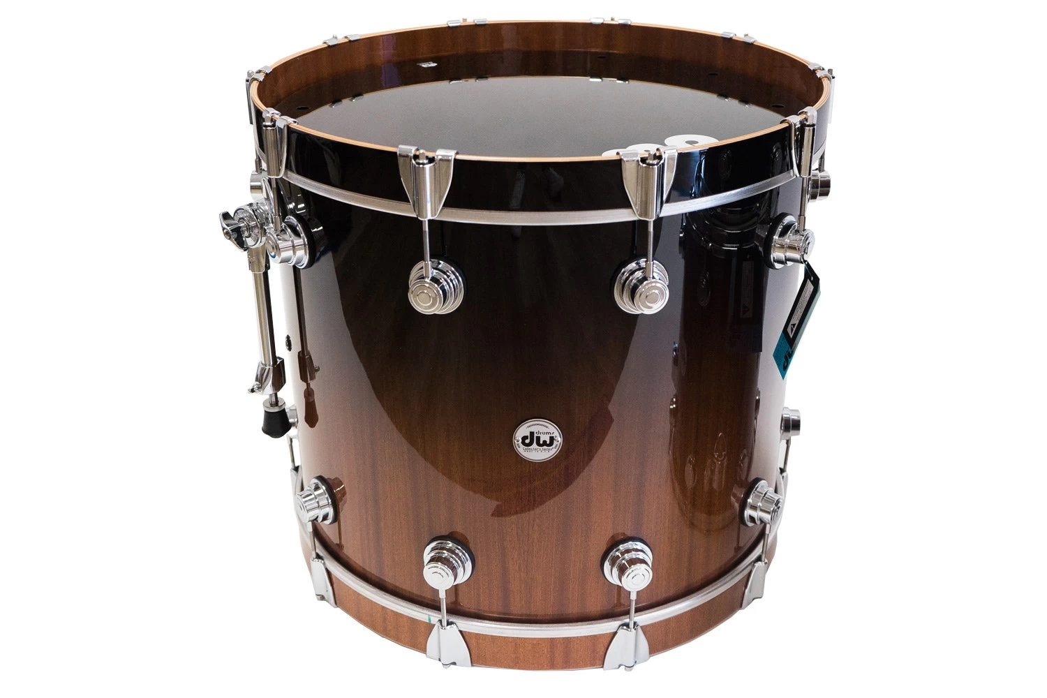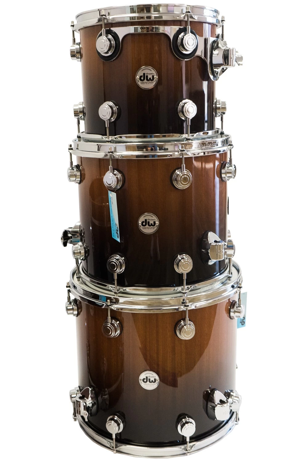 This is a DW Collector’s Series 4-Piece Shell Pack, with Maple/Mahogany Hybrid shells and SSC (Specialized Shell Configuration) Grain Orientation, in a Natural to Ebony Fade finish.