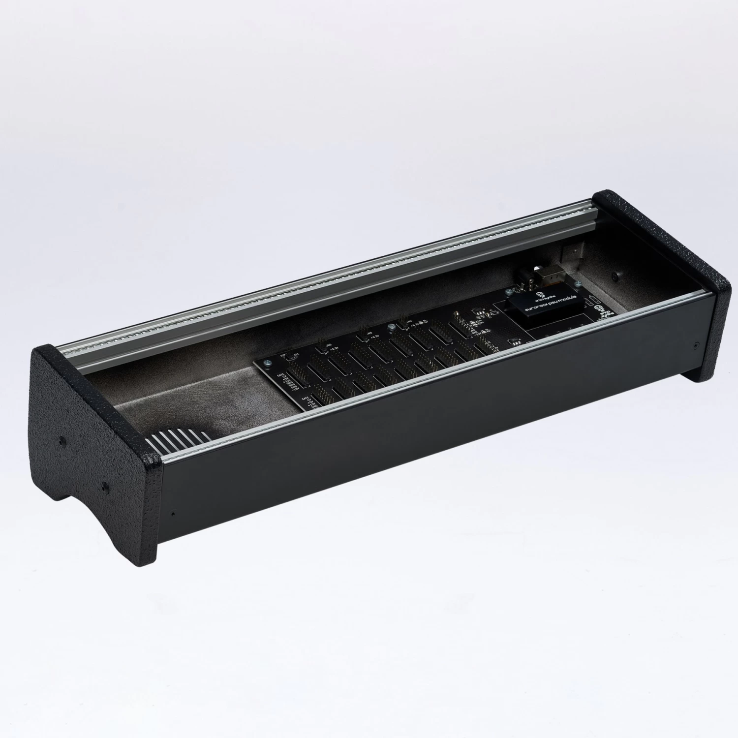 Full aluminium 84HP 57mm deep 1 row eurorack skiff enclosure with aluminium rails of a unique design.