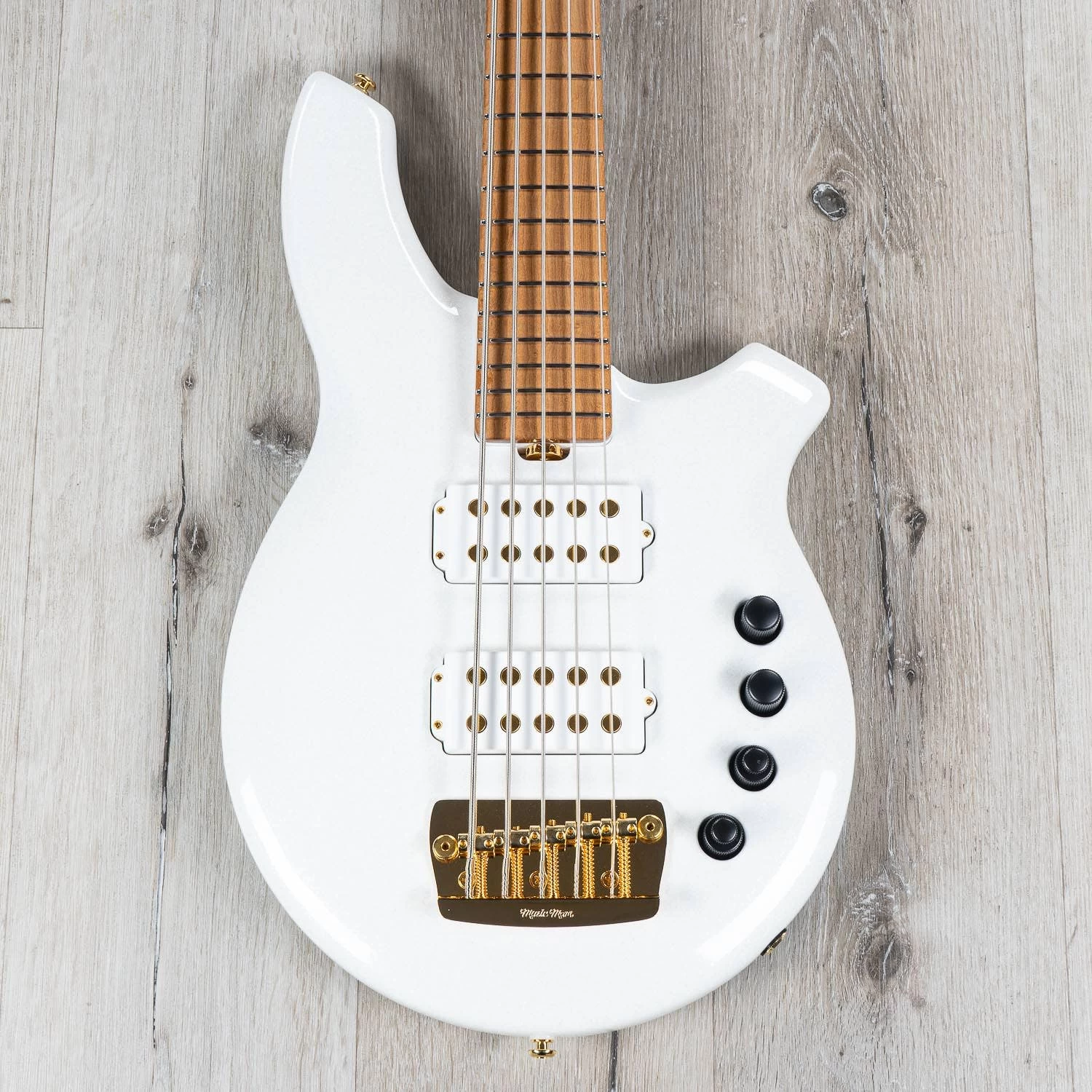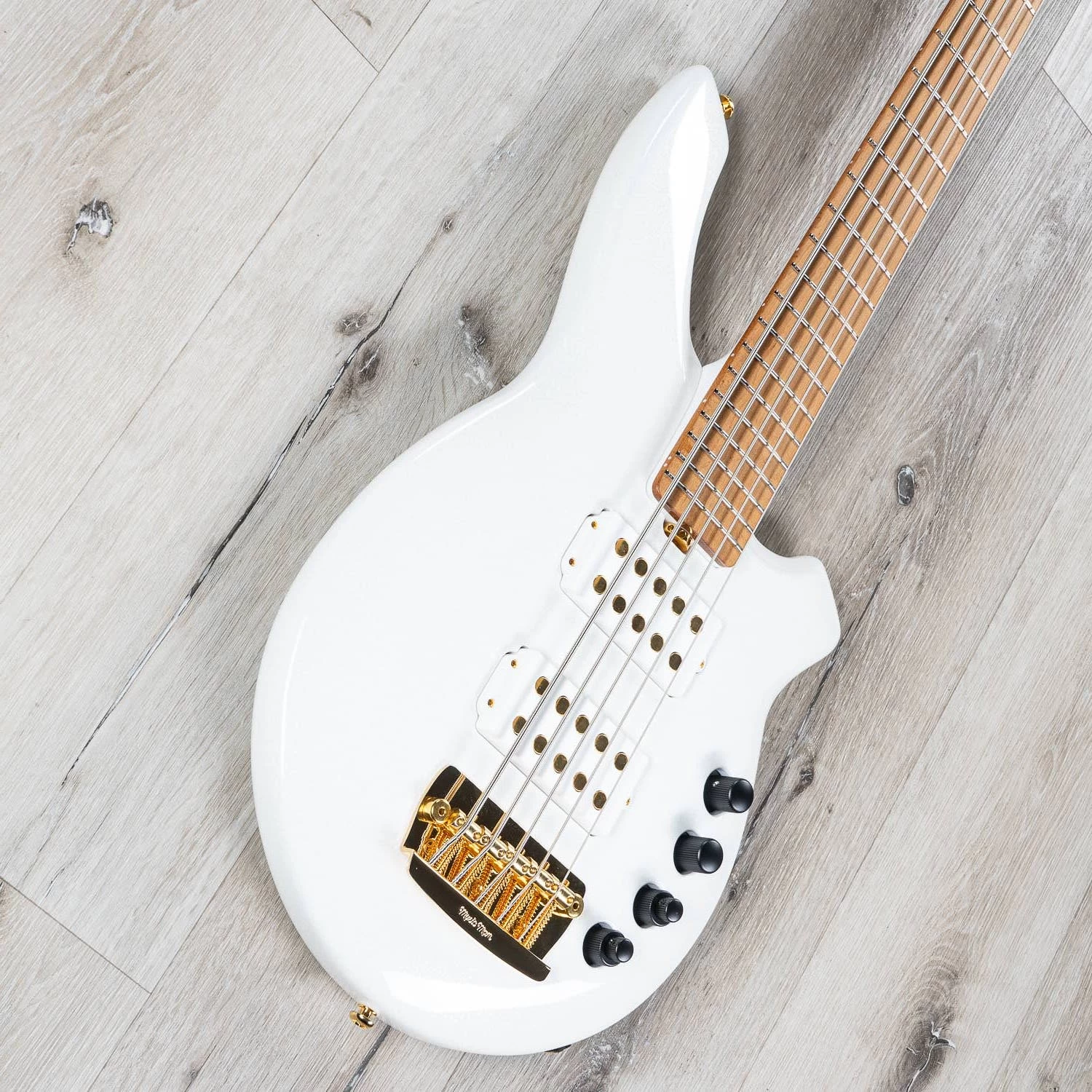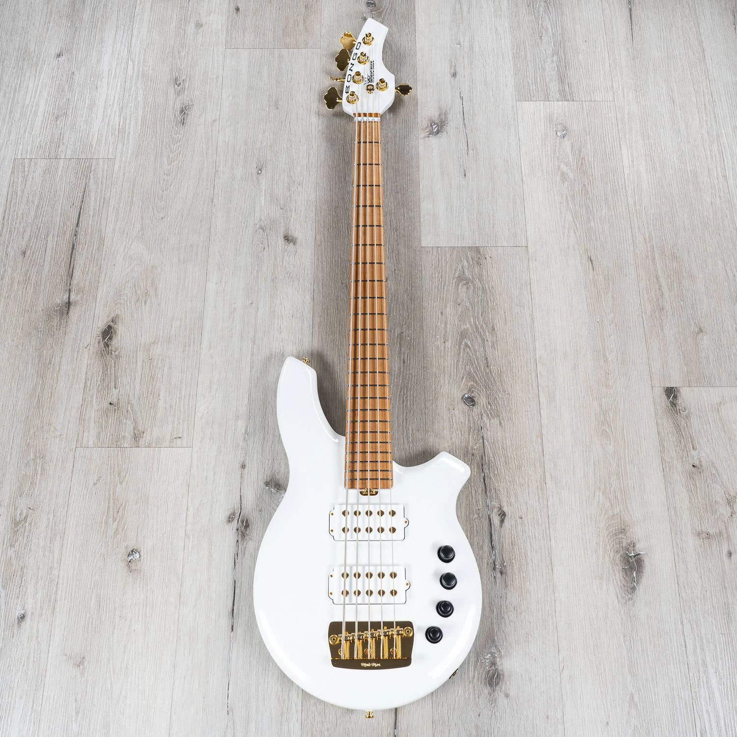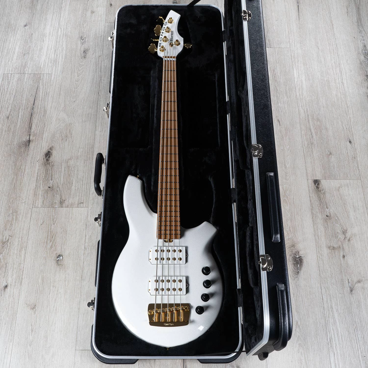 The BFR Bongo 5 Crescendo is a basswood body 5 string bass with dual humbucking pickups in an exclusive all-white sparkle finish. The Roasted flame-maple neck and fingerboard is outfitted with 24 nickel frets and comes standard without fretboard inlays. This special edition BFR Bongo 5 is beautifully accented with gold-plated hardware, gold pickup pole pieces, black control knobs and comes without a pickguard to provide a cleaner, simplified look. The Bongo comes standard with an 18-volt 4 Band Preamp, matching painted headstock, and is limited to just 60 pieces worldwide.