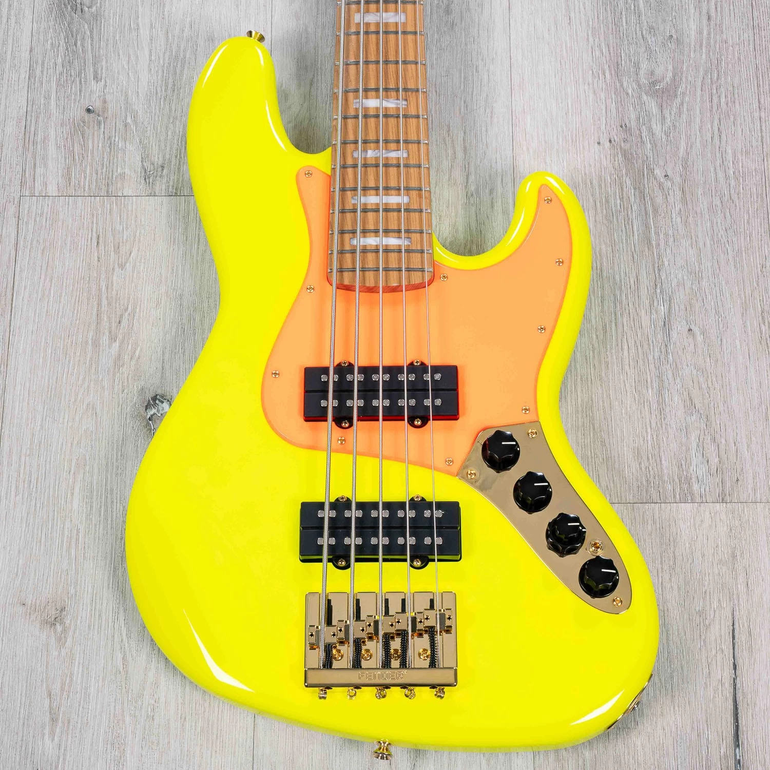 Avante-garde soul and funk player MonoNeon epitomizes coolness in the bass world of today, and his new signature Fender Jazz V follows suit perfectly – this has got to be one of the coolest Fender basses we’ve gotten in in a long time. Immediately upon feasting your eyes on this beast, the loud and funky Neon Yellow finish sticks out in the best way, and the “traffic cone” orange-painted pickguard, matching orange headstock, and gold hardware on the extravagantly-adorned roasted maple neck with pearl inlays only adds to the unique charm. The roasted maple neck isn’t just for show, either – the feel of it is just amazing especially when cranking out steady rhythms and grooves on the lower strings, and really helps to make the 5-string neck width feel comfortable for 4-string players. The stability of the neck also helps keep the low B string tight despite it being a standard 34″ scale length as well.