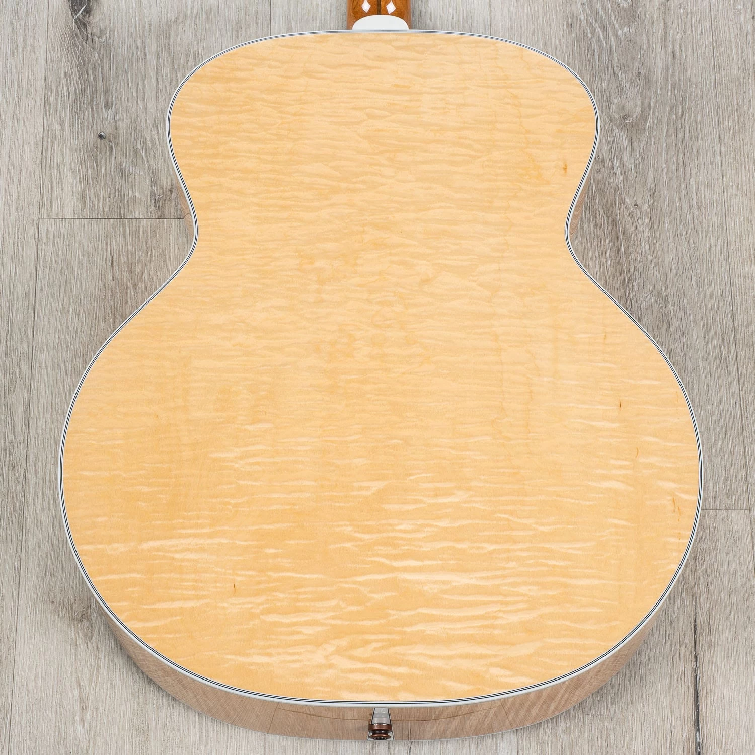 The flame maple back and sides, along with being beautifully figured, add a brilliance and brightness to the sound that is very welcomed in a jumbo acoustic like this. It’s great to have some of those treble frequencies ringing out along with the powerful bass. It makes for a beautifully warm sound that can cut, at the same time. The slight mid-scoop that is natural to this guitar works wonderfully well for most singer-songwriter styles as it produces a big sound without stepping on the vocals. The spruce on it provides some nice natural compression as well so even as you dig in hard, the top won’t overdrive and start to flutter out. The sound remains tight, full, and dynamic.