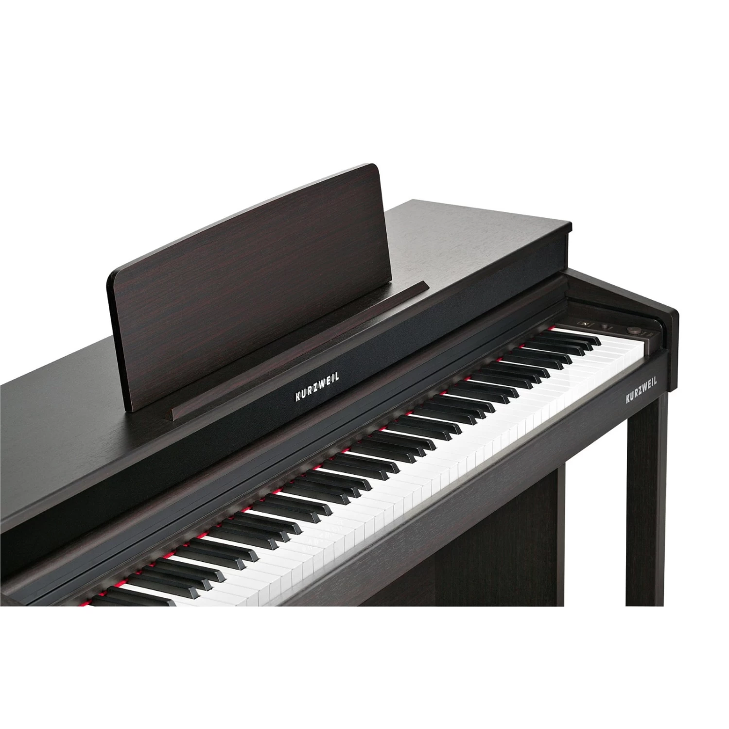 Spinet-style cabinet available in satin rosewood or white finishes, featuring a built-in music stand, slide-out fallboard and powered by a dual 25 Watt 4-speaker, stereo sound system.