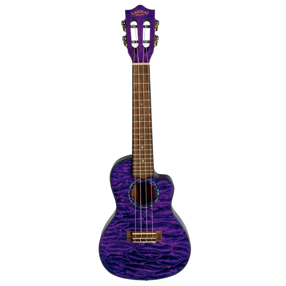 A Lanikai Quilted Maple cutaway electric concert ukulele in trans purple has a wider nut for player comfort, select figured wood, Grover® open back tuners on a slotted headstock, multi-ply black ABS body binding, NuBone XB® nut and saddle, D’Addario® strings, Fishman® Kula preamp and tuner, glossy finish, foam case and a Limited Lifetime Warranty. From an intimate acoustic stage to a concert stage a Lanikai quilted maple series is an excellent choice for performance. Built as a reliable go-to ukulele, a quilted maple Lanikai is favored by artists around the globe.