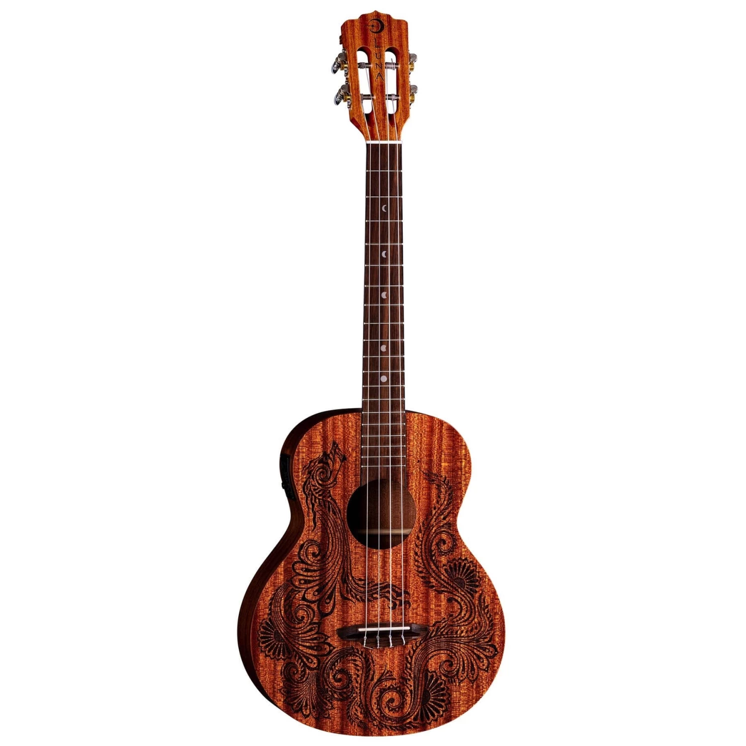 Let the strength of the Dragon lift your spirits to try anything new. Historically, the symbol of the fearless Dragon is deeply rooted in many cultures across the world for its spiritual meaning of offering courage to those who need strength the most. Much like its acoustic guitar counterpart, the Henna Dragon Mahogany Baritone uke is a powerful ally to have by your side along your musical journey, whether you are learning how to play or in it for the long road. Built on a larger baritone body shape, expect an abundance of deep warm tone coming from the all-mahogany body. Enjoy fluent articulation with Aquila strings and an elegant slotted headstock. Feel a level of confidence amplifying your sound on the big stage with the Luna preamp and built-in tuner. The power is at your fingertips and the dragon is there to guide you every step of the way! Gigbag included. Join the Luna Tribe! Designed by UK Henna Artist, Alex Morgan.