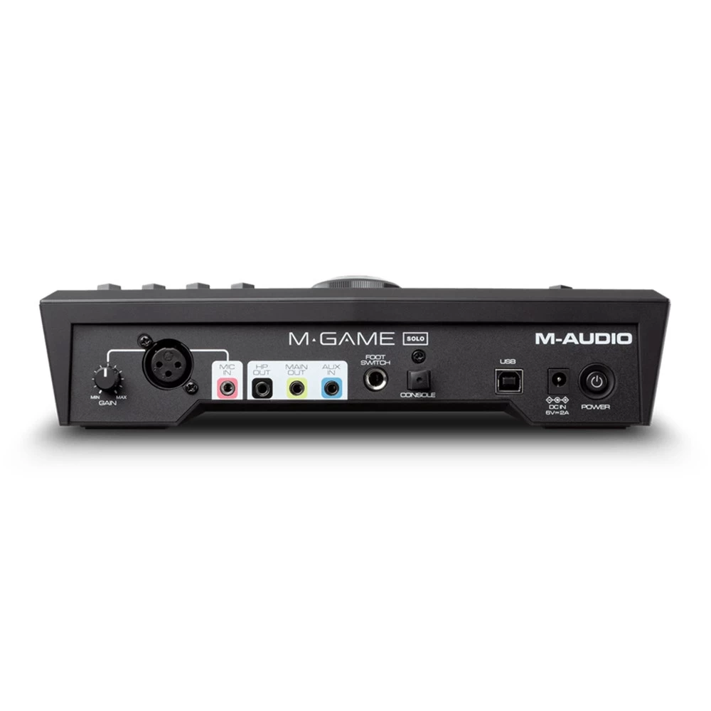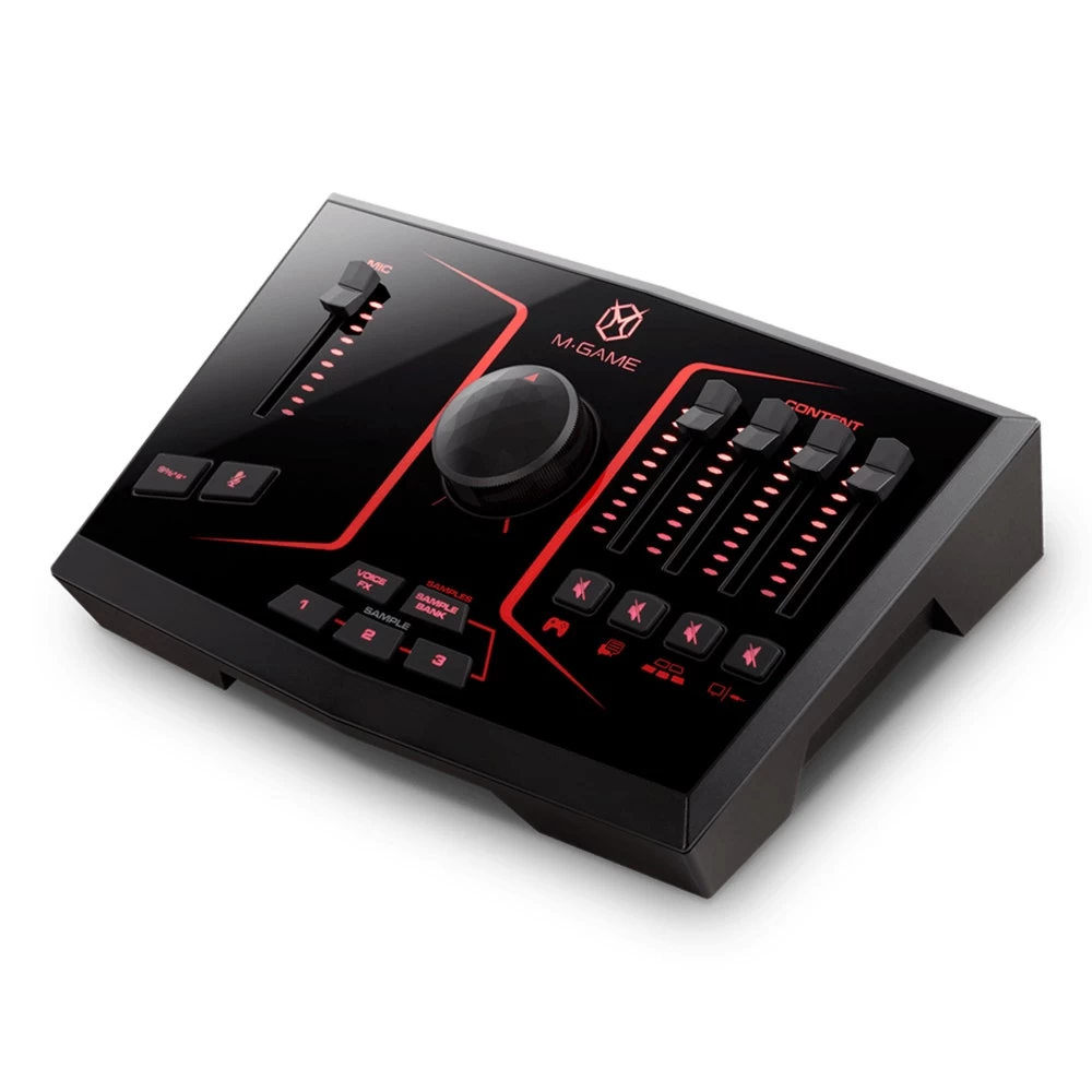M-GAME SOLO is a USB streaming audio interface/mixer with LED lighting, sampler, and voice shaping and effects combined with a professional audio interface and physical mixing control surface.