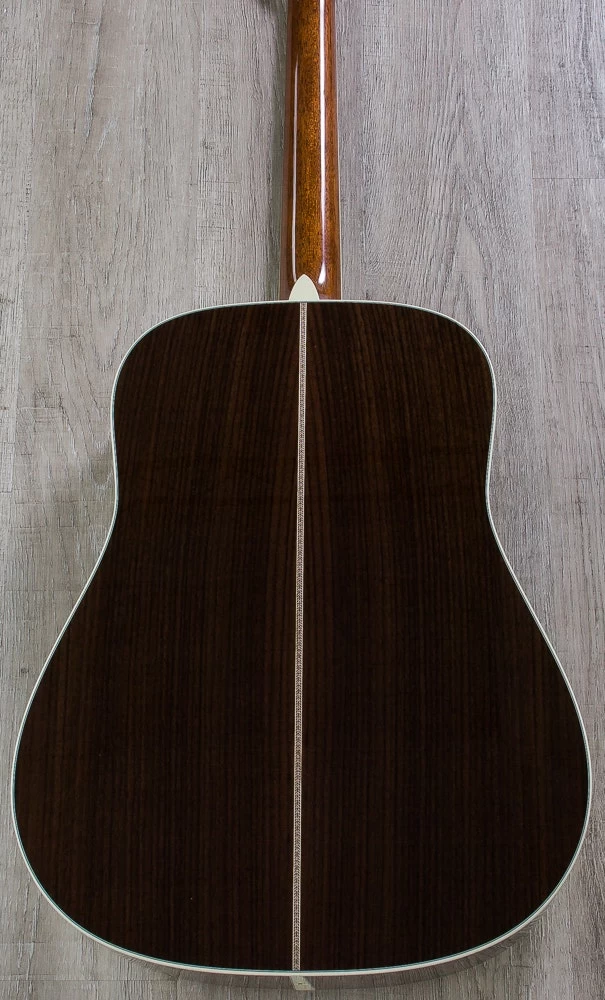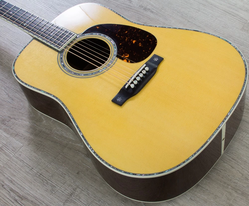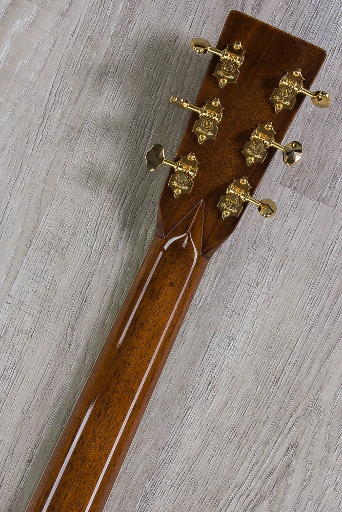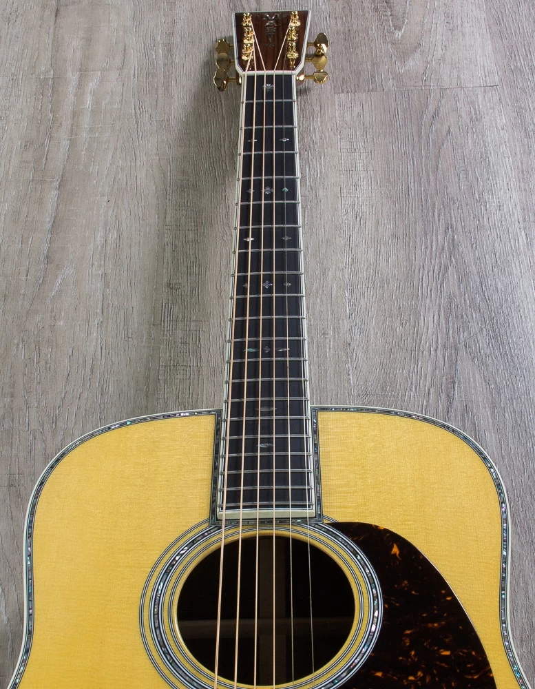This iconic D-42 fuses classic, inimitable Martin construction with great aesthetics and tops it all off with a supremely comfortable neck. First things first – the top of this guitar is solid Sitka spruce and the sides and back are solid East Indian rosewood. This is a tried and true tonewood pairing for acoustic guitars that provides balanced projection and nuanced subtlety. It’s a perfect match for the dreadnought body style, which naturally sculpts the low end. What’s under the hood of this iconic guitar is just as important as what you can see. Under the top, the solid Sitka spruce braces are arranged in a standard scalloped, forward-shifted “X” pattern. This allows the top to vibrate more freely without compromising strength. It has a distinctly more pronounced tonal character than non-scalloped guitars. The dovetail neck joint is crucial to this guitar’s sound and stability as well.