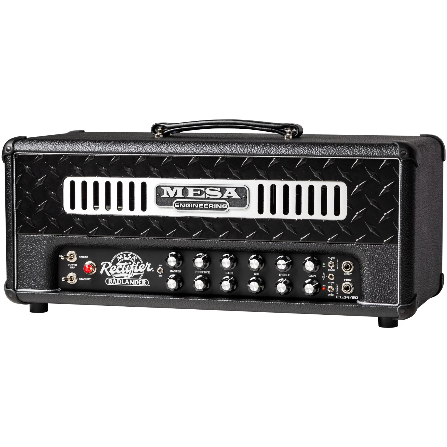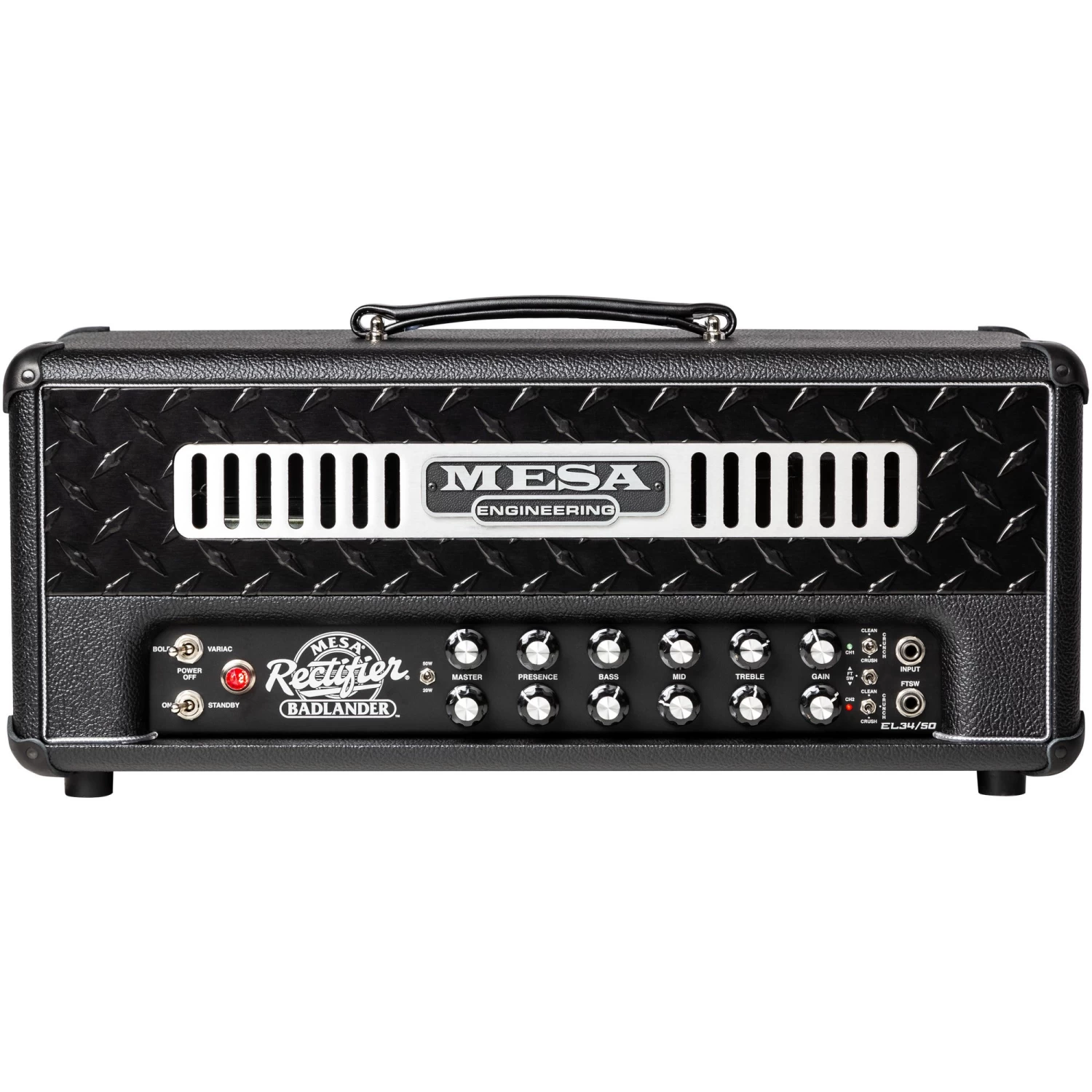 Here in the Badlander 50, the 2-Channel preamp hooks up with two different and perfect power displacements that enhance everything from clean to clipped to wildly saturated. The 50 Watt setting delivers bold authority and the highest headroom while the 20-watt setting finds the power tubes re-wired for Triode operation that unveils greater clipping potential and a mid-scooped, harmonic-laden response that reveals trademark EL34 Tone.