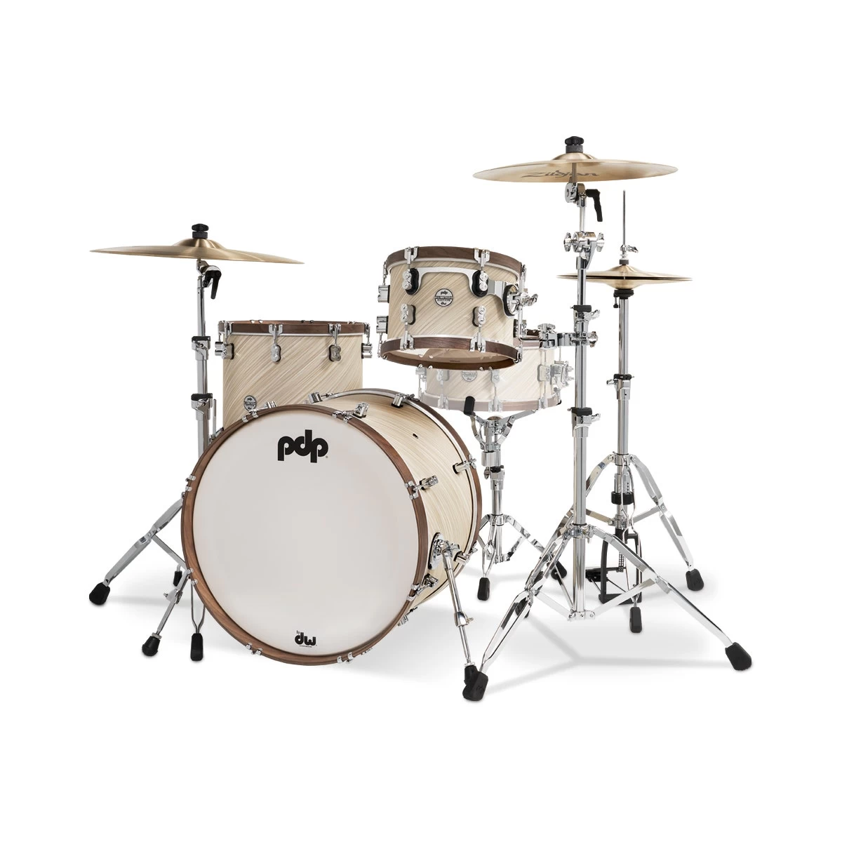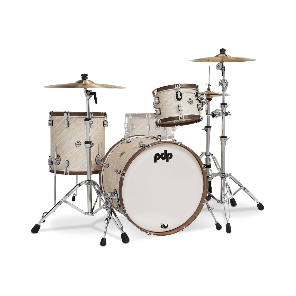 on this all-European maple limited edition shell pack that’s dressed up in Twisted Ivory with natural walnut hoops. The hoops give the traditional-size toms a fatter, warmer tonality and let’s face it—they just look cool.