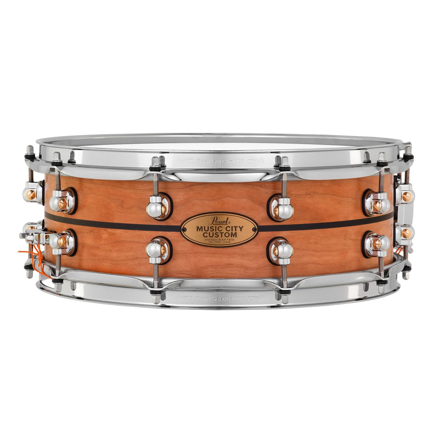 This stunning Music City Custom Solid Shell Snare Drum features a center inlay of premium Ebony wood. Honed by a singular artisan with time-honored precision, each Pearl’s Music City Custom Solid Shell Snare Drum is a uniquely refined, American-made percussion instrument. Beginning with a steam-treated plank of premium North American Cherry, each Music City Custom solid shell is shaped using an old-world crafting technique derived from ship-building. Hand-milled to a smooth, uniform 8mm thickness and combined with Solid Maple reinforcement rings, each shell is CNC drilled, hand-finished, and assembled at Pearl’s Music City Custom Shop in Nashville, TN. Pearl’s single STL swivel lugs, Stainless Steel tuning rods, and SuperHoop II triple-flanged hoops complete the drum, making this one-of-a kind percussion instrument an investment in the ultimate drumming voice.