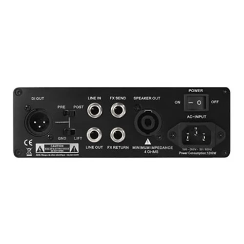 Other features include Mute /Passive/Active Switch, Headphone out and auxiliary input jacks, Balanced line out with pre/post EQ and ground lift switches, FX send/return Jacks, Pre Amp out and Power amp input jacks and a High-Current Speakon Out.