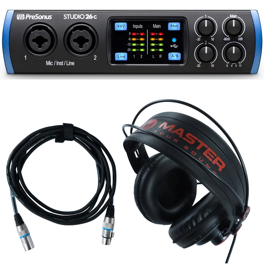 Ideal for DJs, mobile musicians, and electronic musicians who want excellent audio quality in a sturdy, portable form factor, the bus-powered Studio 26c 2-in, 4-out audio interface records at up to 192 kHz and features mic/line/instrument inputs, DC-coupled line outputs, MIDI I/O, and a Cue Mix A/B button. A complete, all-in-one recording package, the Studio 26c comes with PreSonus’ award-winning Studio One® Artist music production software for macOS® and Windows® and includes USB-C to USB-C and USB-C to USB-A cables for compatibility with most computers.