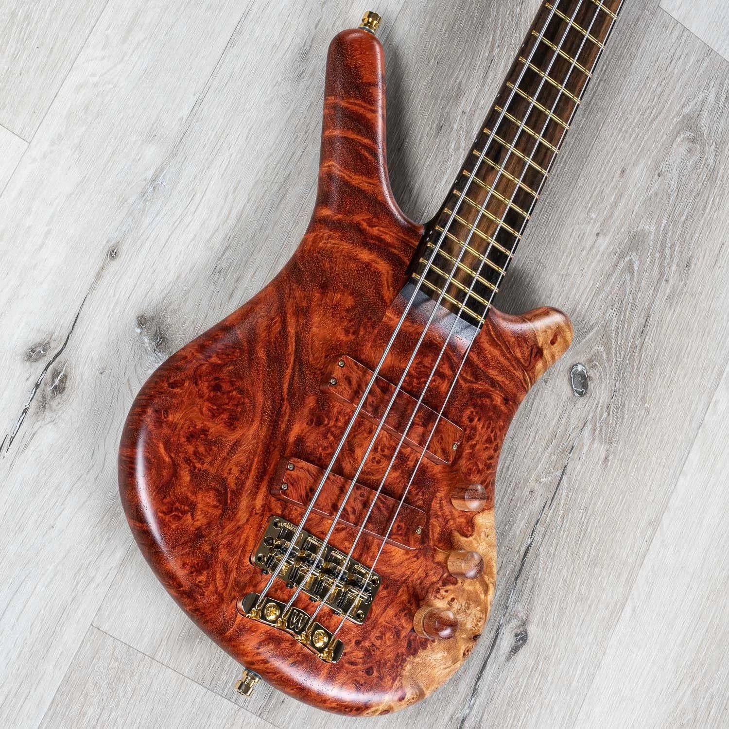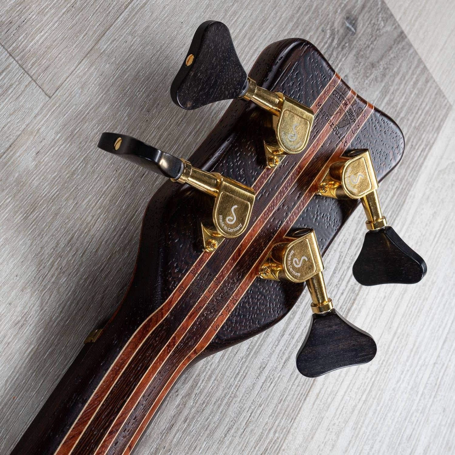Everywhere you look on this beauty is a feast for the eyes. The body, knobs, control cover and pickup covers are all made out of gorgeous figured Bubinga burl wood that’s figured as all heck. The fretboard is a tigerstripe ebony piece while the neck has wenge, bubinga, and maple in it. Along with the beautiful aesthetic, everything from the tuners, to the neck, down to the body has an incredible feel and it’s instantly evident that Warwick’s top builders were put to task on this one. They don’t call it “masterbuilt” for nothing. But, of course, this bass is much more than just a good-looking instrument. The attention to detail throughout is simply immaculate and the overall feel is incredible, but this will be equally matched by the powerful tone this pumps out.