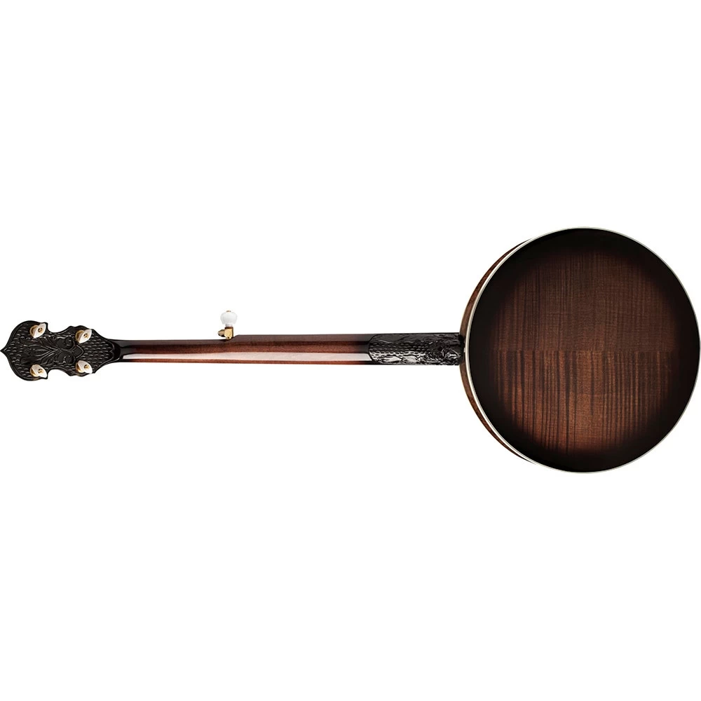 - Additional Info: Flame Maple resonator and maple rim, one piece flange, 11″ diecast tension hoop, Bell Brass tone ring, Clamshell tailpiece, engraved gold armrest, all 5 geared Planetary tuners and separate coordinator rods.