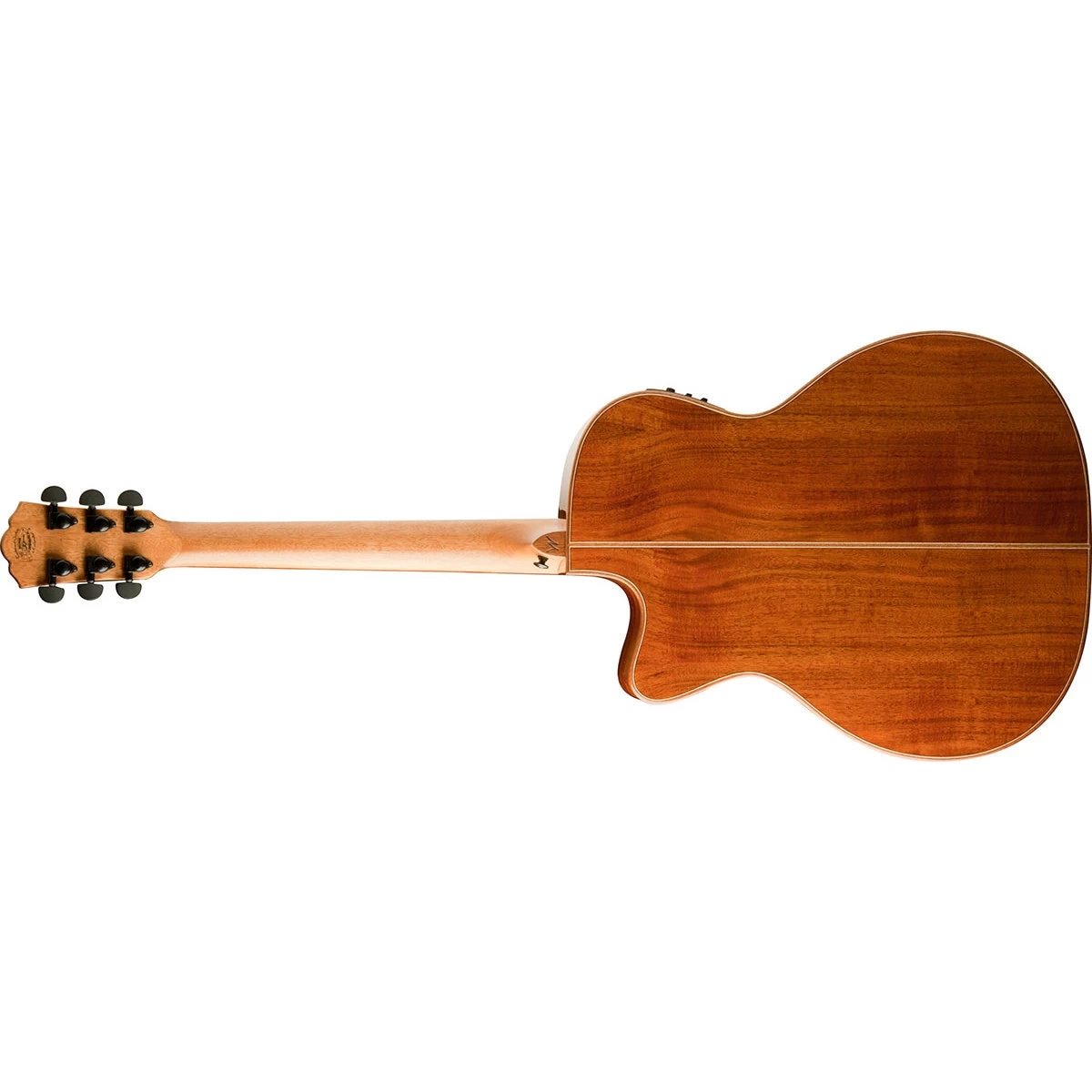 The Comfort G55CE Koa is a Grand Auditorium style acoustic/electric guitar with a Venetian cutaway for superior upper fret access. A highlight of the Comfort Series is the deluxe re-curve style ergonomic armrest bevel at the lower bout which becomes part of the mahogany top binding. The guitar features a Koa top and Koa back and sides, mahogany/maple bound body and headstock. The satin finished mahogany neck has an Ovangkol fingerboard devoid of inlays and in tandem with the mahogany bound Ovangkol bridge adds an aura of understated elegance. A maple/mahogany/maple strip splits the book matched Koa back as well. The headstock features a mother-of-pearl Washburn logo and 18:1 ratio tuners. The Washburn Parquet style rosette is made of alternating maple and mahogany.